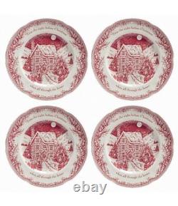 A Beautiful Set of Four (4) Porcelain Dinner Plates in the Twas the Night (Before Christmas) pattern by Johnson Brothers / Bros. These Lovely Dinner Plates feature ivory - colored porcelain decorated in red with a charming scene of a rustic, thatched - roof house with chimney, picket fence and wreath on the door, mountains and fir trees in the background. Each piece from this Series, which is based on everyone's favorite Christmas story -'Twas the Night Before Christmas by Clement Clarke Moore, has a different scene with different parts of the story - this one reads: " Twas the night before Christmas when all through the house". 10 1/2 in diameter and is dishwasher and microwave safe. They come with the Original Red Johnson Bros.